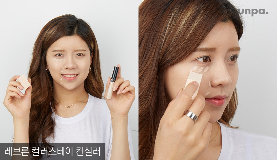 베이스를 고르게 밀착시키지 않으면 피지에 쉽게 뜰 수 있어요. 물먹인 스펀지를 평소보다 더 꽉 짠 뒤에 전체적으로 두드려주세요. 컨실러 바르지 않은 부분도 두드리는 것 잊지 말기!