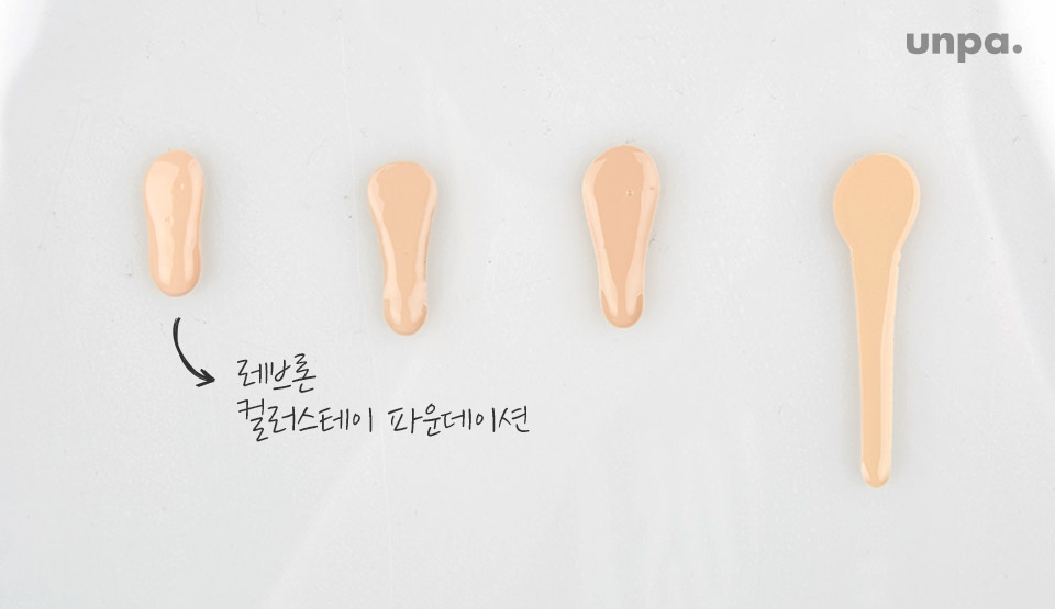 두 개의 파운데이션을 볼에 피부에 올린 직후 파우더처리 없이 손가락으로 한 번 그었을 때 오른쪽처럼 손자국이 나면 여름에 부적합한 제품!