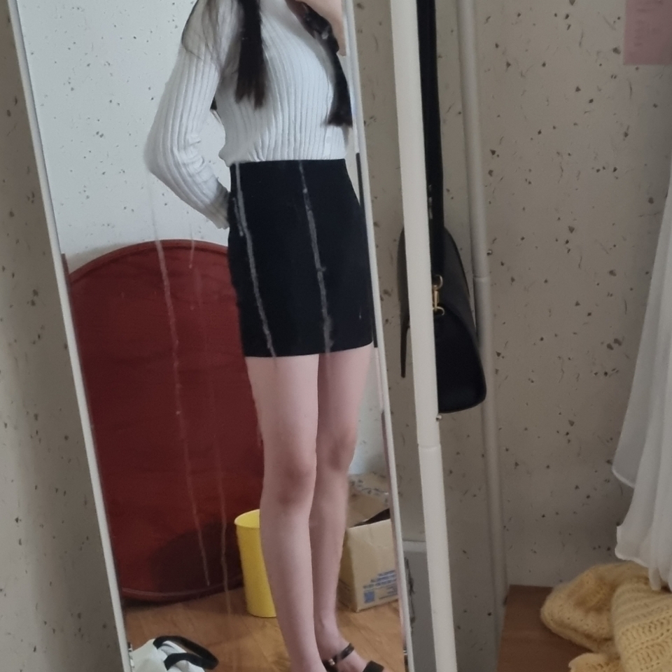 거울이 깨끗하지 않은점 죄송하구.. 위에는 붙는 흰가디건에 밑에는 기본 H라인 스커트 입고 신발은 6셈치 굽있는샌들같은 구두에요..!! 학생이 입고다니기엔 이상할까요,?? 주말에 카페갈것 같은데 친구는 성숙한 스타일인데 저만 너무 추레하면 이상할것 같아서요ㅠㅠ