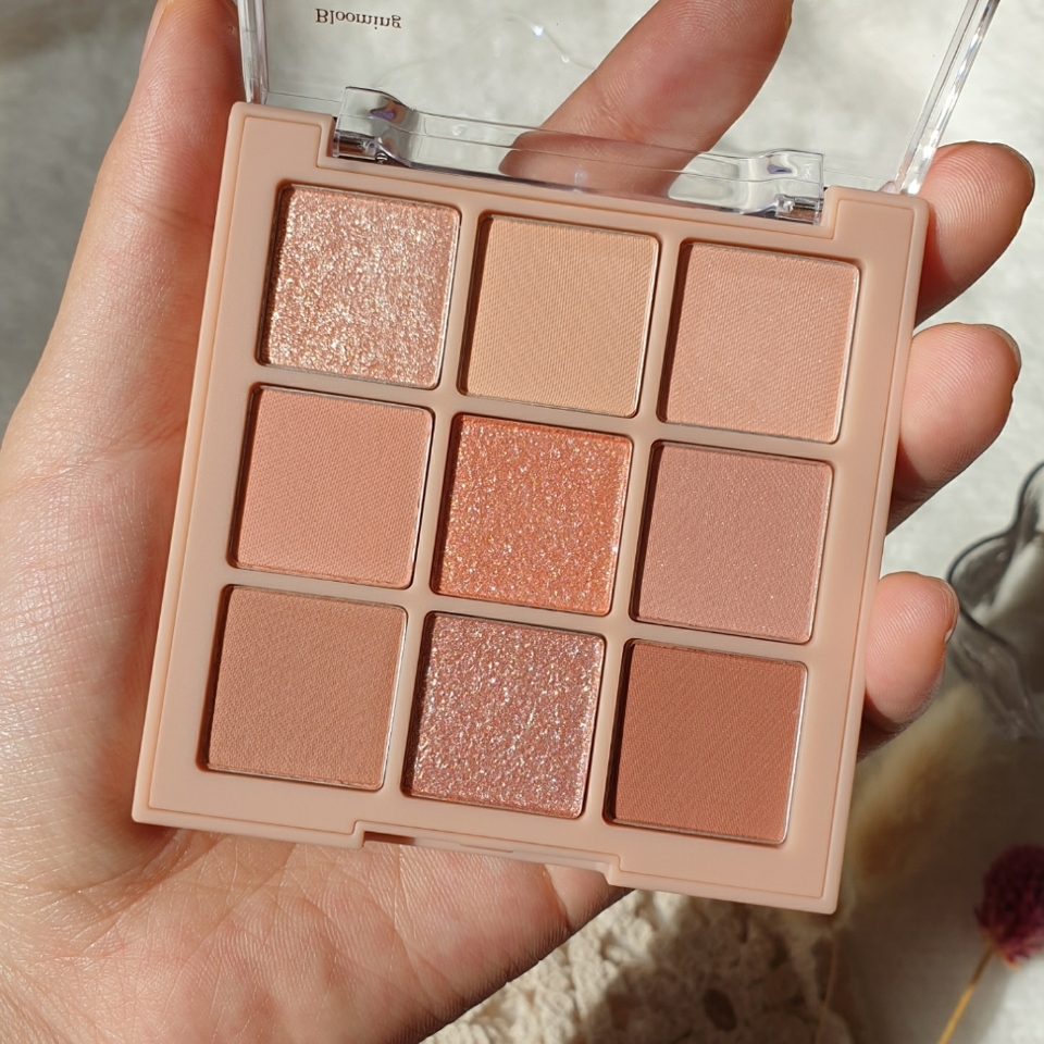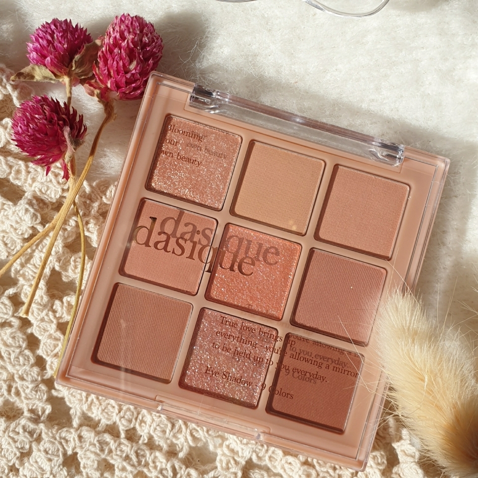 한손에 딱 들어오는 크기로 큰편은 아니에요. 처음에 데이지크 섀도우 팔레트를 접했을때는 크기가 너무 작다고 생각했는데, 요즘은 오히려 이런 크기의 9구팔레트가 잘 나오는 것 같아요. 9구안에 베이스, 음영, 포인트 펄3가지 등 컬러구성 푸짐하게 들어있습니다.