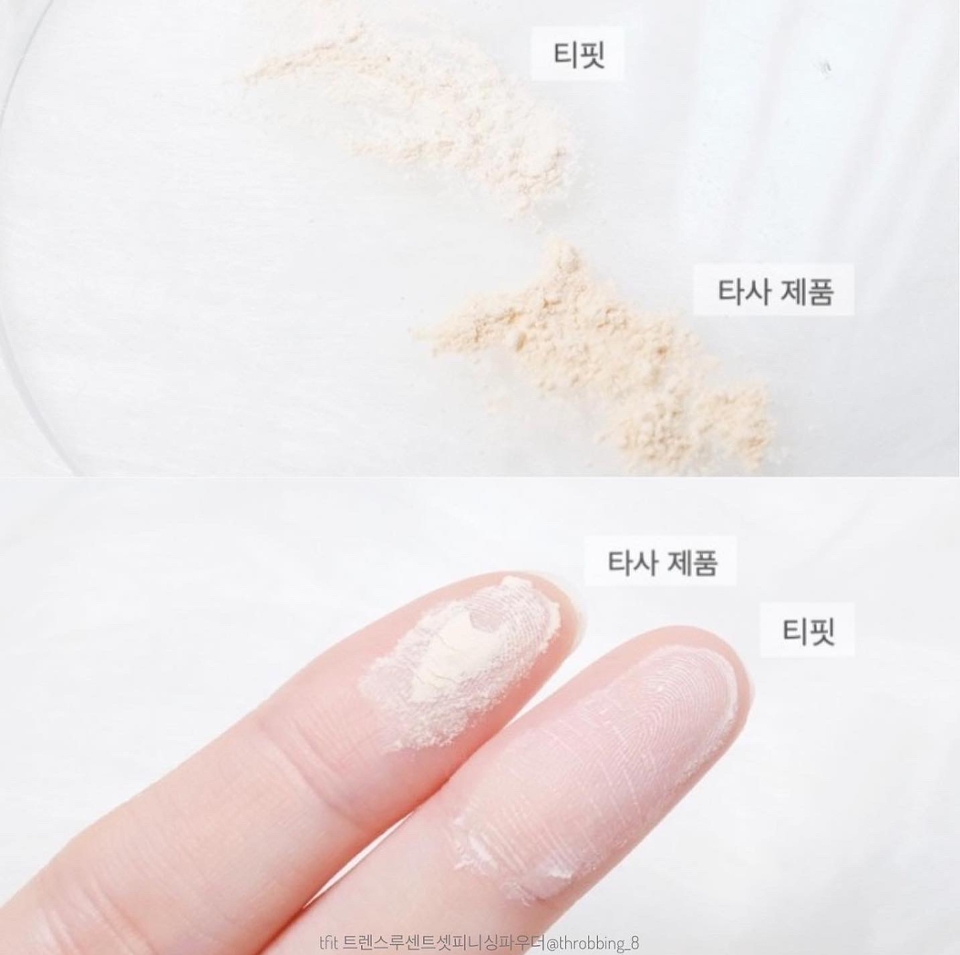 실제 비교해봤을때 티핏제품이 더 밝고 아이보리의 느낌이 강하고 입자의 크기도 티핏 제품이 더 고운 것을 볼수있어요. 비슷한 양을 손으로 묻혔을 때 타사 제품은 뭉침이 보였고 티핏은 너무 곱다 보니 아무리 많이해도 얇게 올라가더라구요.