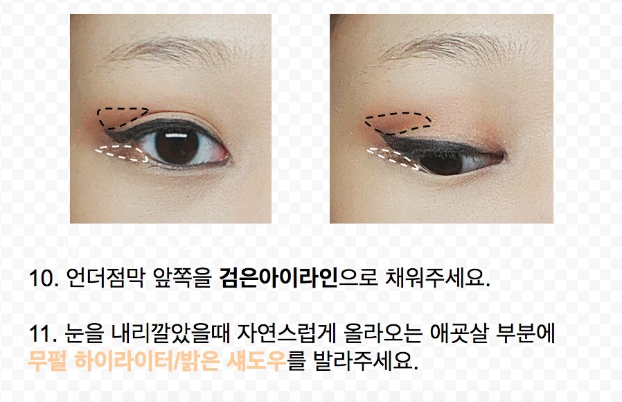 섀도우의 색감보다는 음영과 아이라인에 많이 의존하는 메이크업인데, 잘 따라오셨나요?