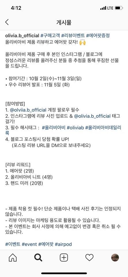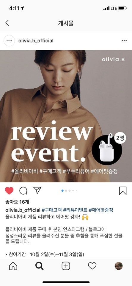 사무실에서 입을 기본핏 가디건이랑 니트 찾고있었는데, 지금 올리비아비에서 기획특가 행사중이더라구요! 기본템이라 실패할 확률은 적을것같은데 그래도 혹시 입어보신분 있나 궁금해요~! 그리고 지금 인스타에서 에어팟 리뷰이벤트도 하고있길래 공유드려용 ㅎㅎ 갑자기 너무 추워졌네요 ㅠㅠ